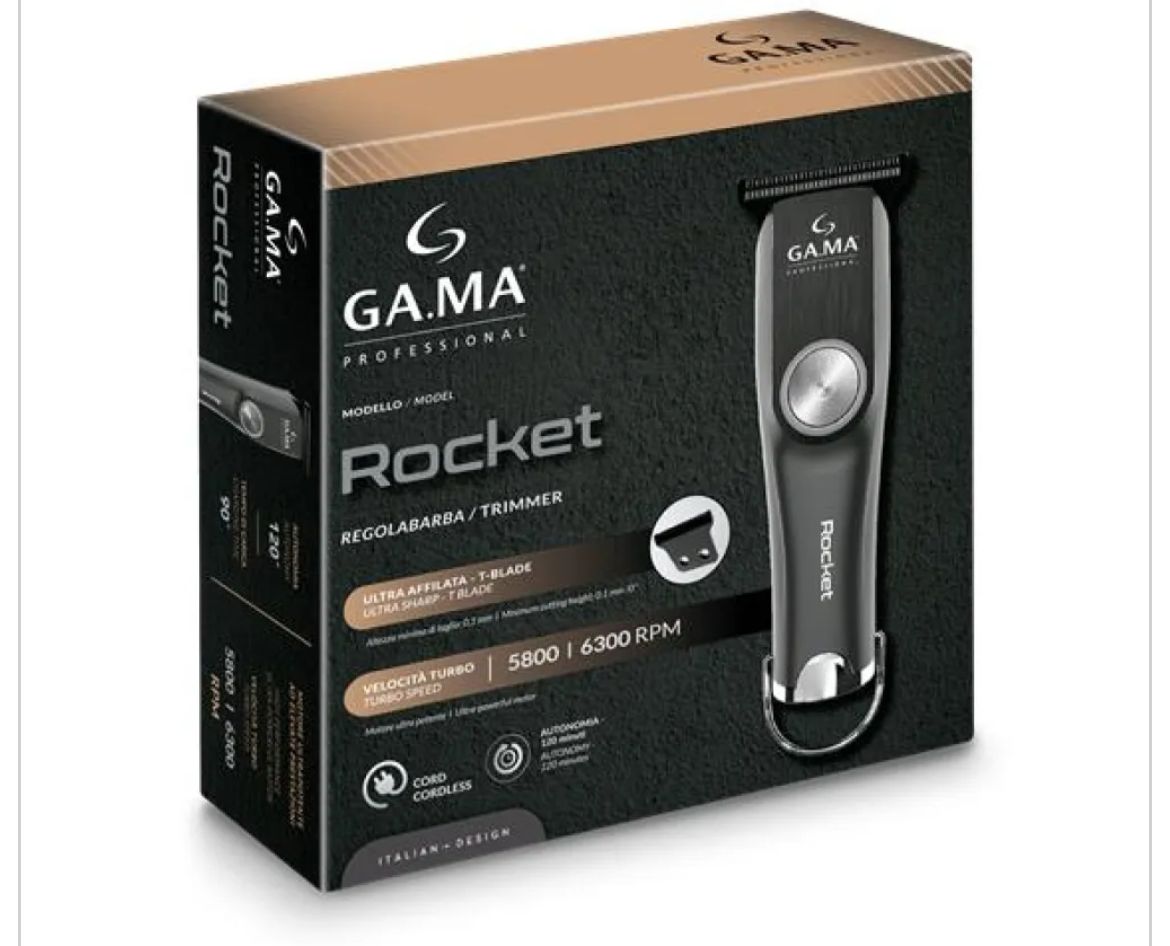 Gama Trimmer Rocket es una afeitadora compacta con cuchilla T-Blade, corte de precisión de 0.1 mm, velocidad turbo (5800-6300 RPM) y 120 min de autonomía. Diseño italiano para resultados rápidos y definidos.
